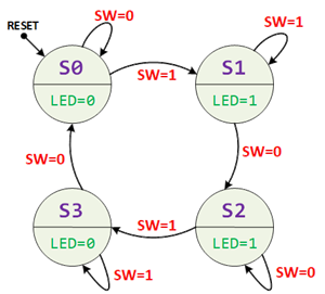 Transition Labels: Input/Output (e.g., SW=1 / LED=1)